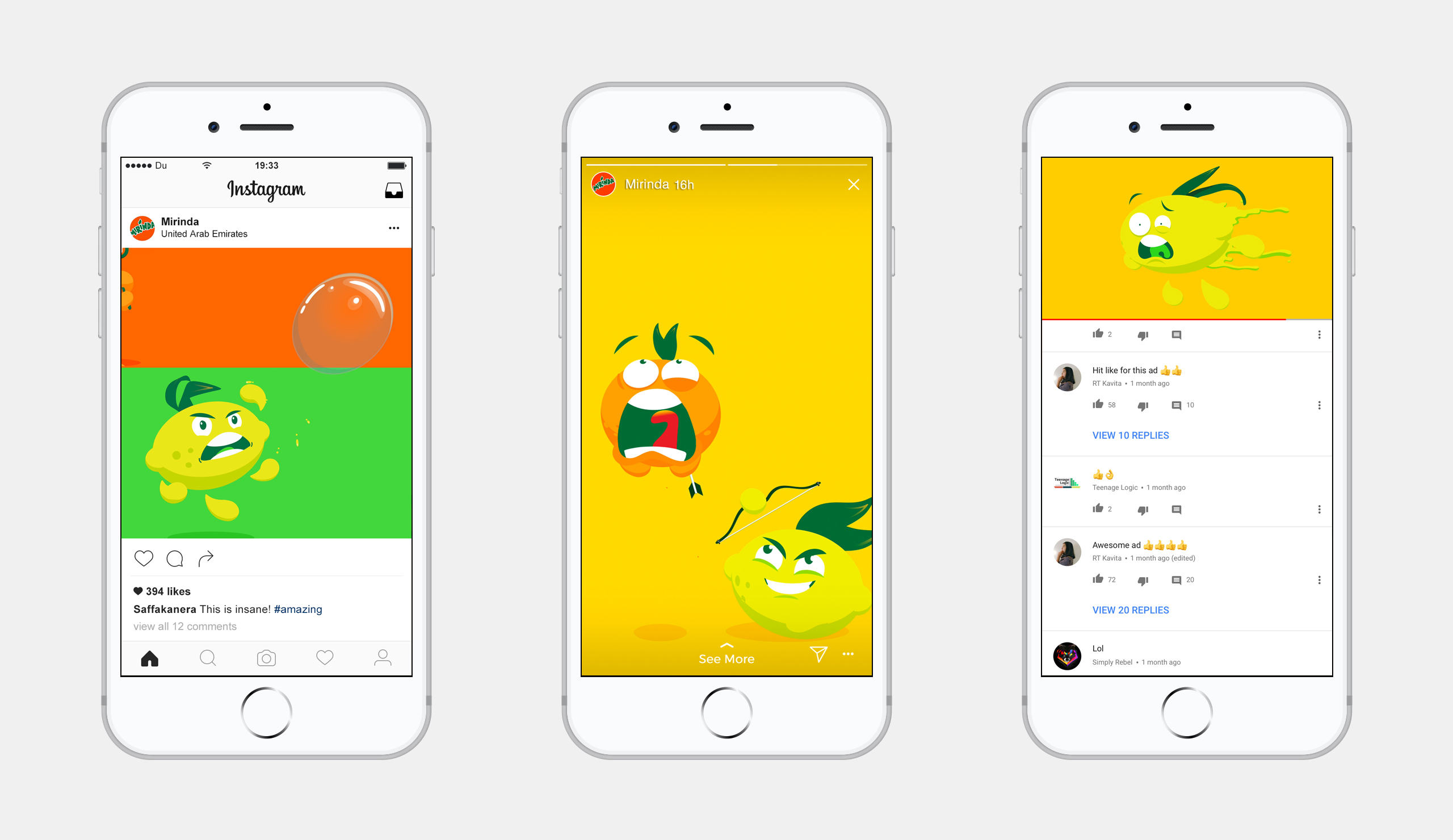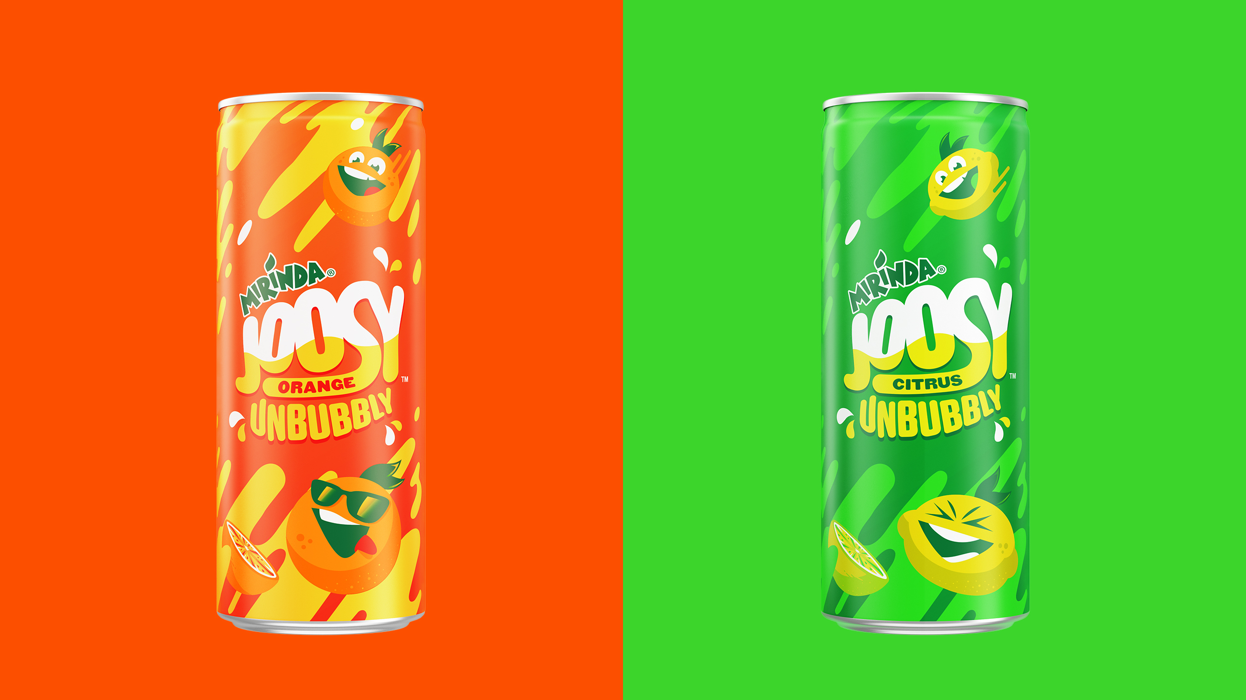 We were tasked with creating packaging and a campaign launch for a new Mirinda product called Mirinda Joosy. It's a drink with no bubbles, less sugar, and added juice. The product is targeted at a younger audience and as such we created characters who personify the flavours they represent. We brought the work to life in a series of films, digital content and even games.
